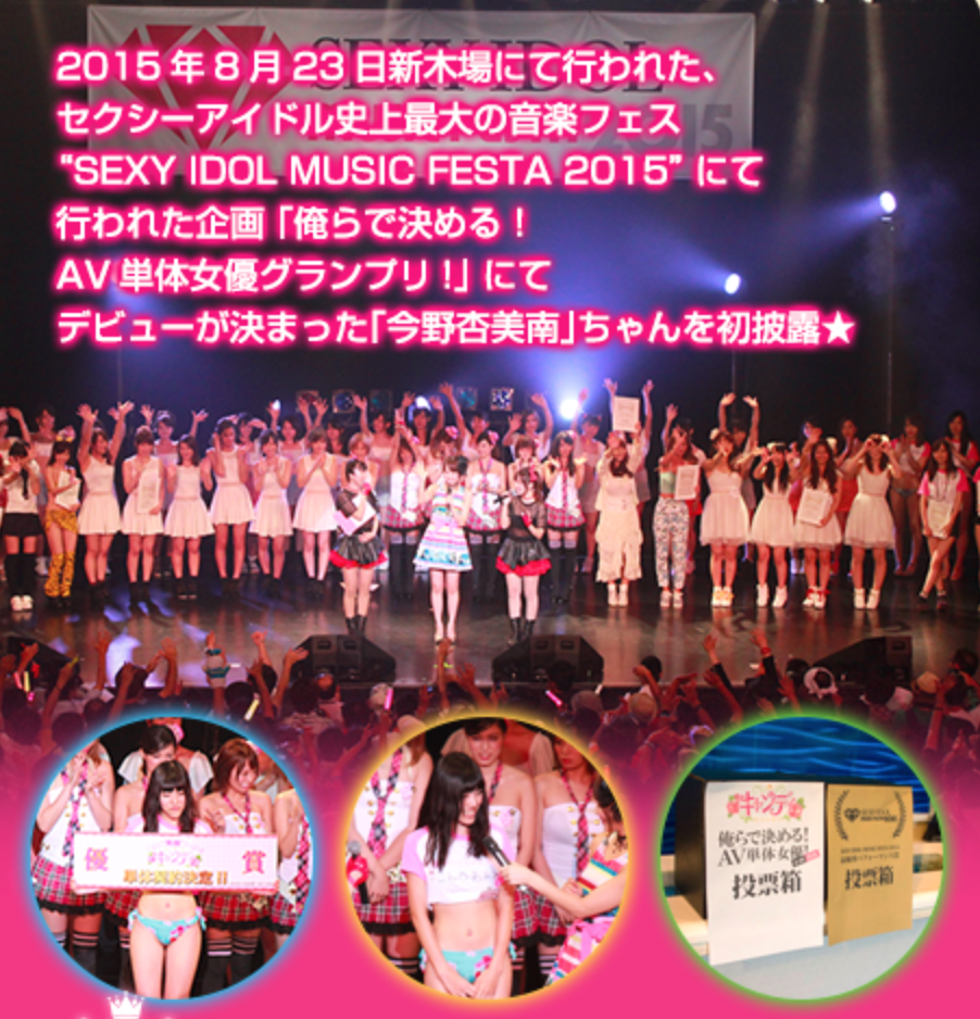 那就是12月1日發片的「今野杏美南」。在這支作品中我們就可以知道這個專屬女優票選活動的全貌:原來是在今年8月舉辦的「SEXY IDOL MUSIC FESTA 2015」上這家片商舉辦了這個專屬女優的票選活動,讓現場超過2000位的觀眾選出心目中最優秀的女優,最後就在主持人吉沢明歩揭曉票選結果後決定由「今野杏美南」成為Candy的主打星: