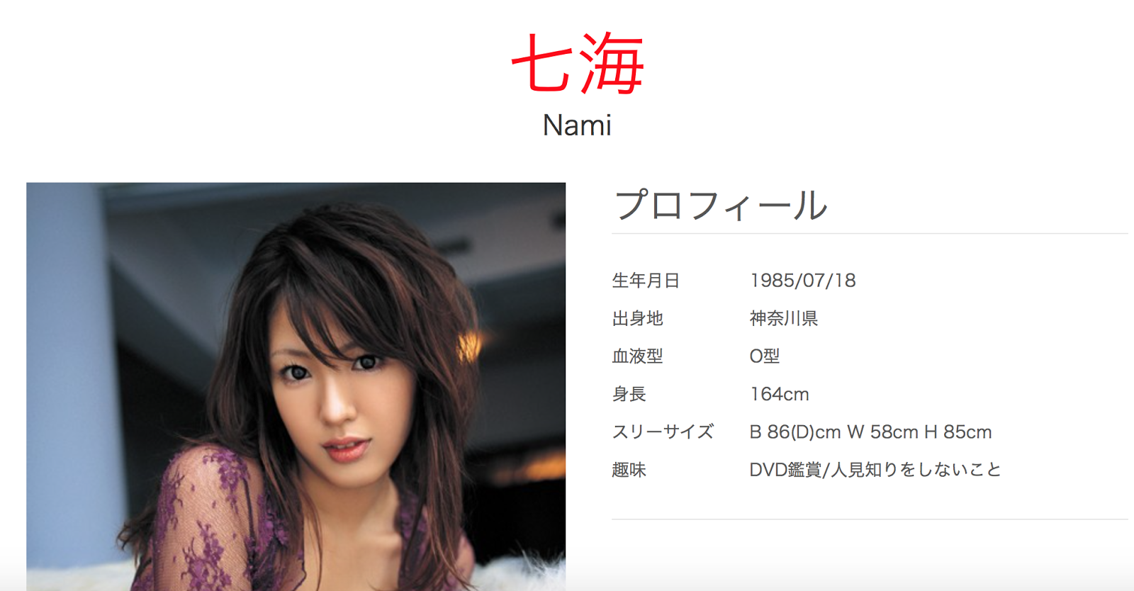 這是一支很麻煩的作品,一來是發片的片商「スカイハイエンターテインメント(Sky High Entertainment)」官網已經關閉,一開始只有那麼一張修很大的封面圖叫人怎麼認?二來是她的基本資料也有很大的問題,因為你用「七海」的藝名加上1985年7月18日生以及164公分、D罩杯的基本資料去找馬上就可以找到一個一模一樣的七海,但怎麼看怎麼怪啊: