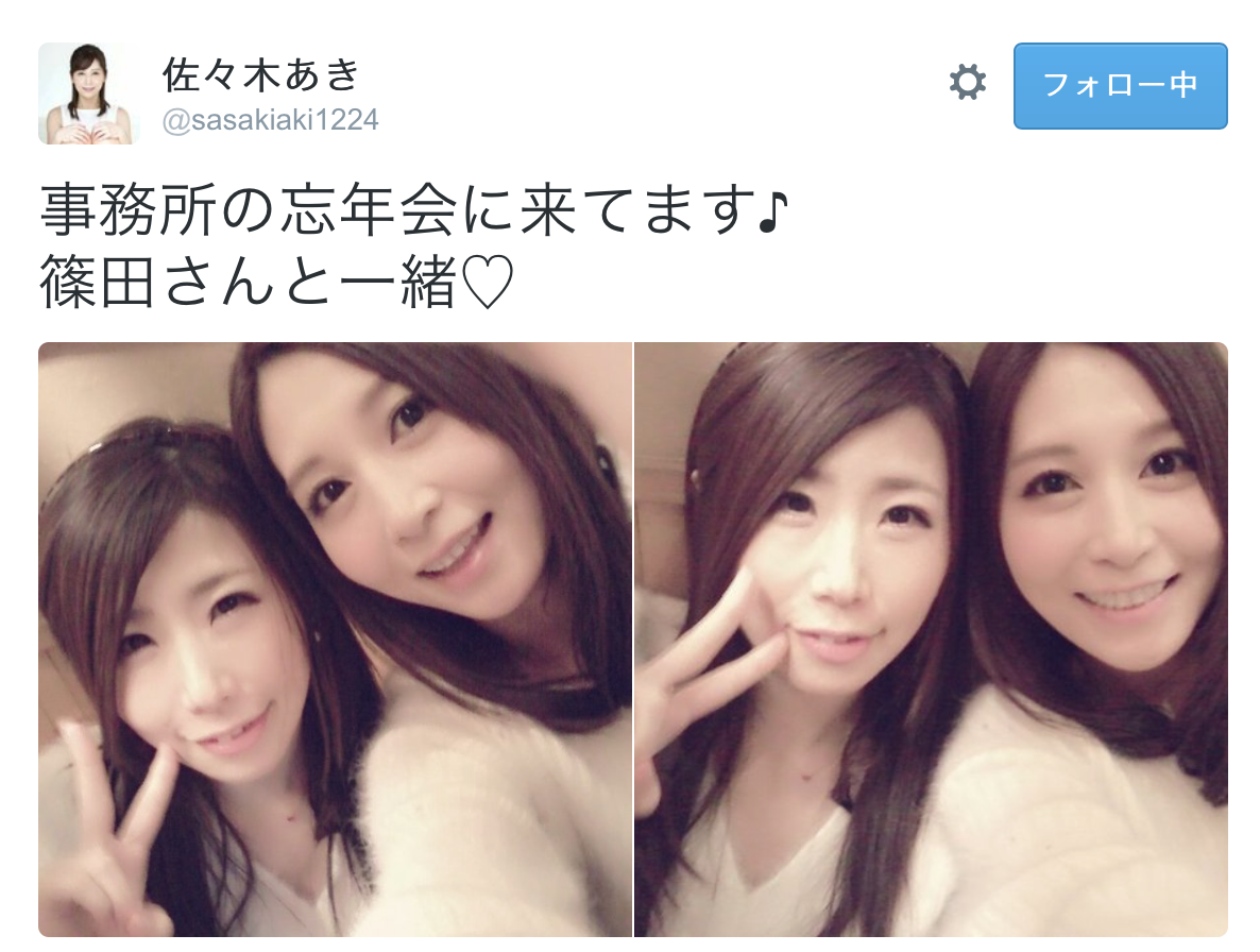 身為SOD集團出身的人妻,經紀公司是不能隨便秀出來的,因為那會讓大家發現SOD說大家都是自己前來應徵的是個謊話;而從這張一樣是和篠田あゆみ(篠田步美)吃尾牙的照片來看佐々木あき(佐佐木明希)就是經紀公司ALL/BKP體系的人,因為事務所舉辦的尾牙和片商不一樣、就只有自己人能吃…