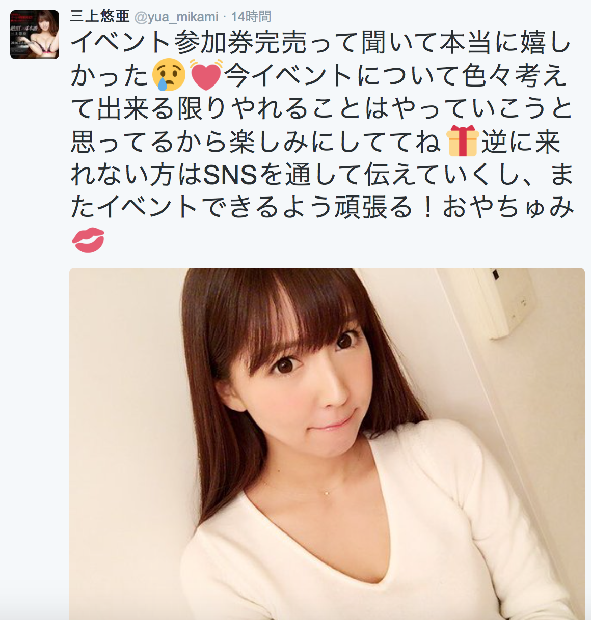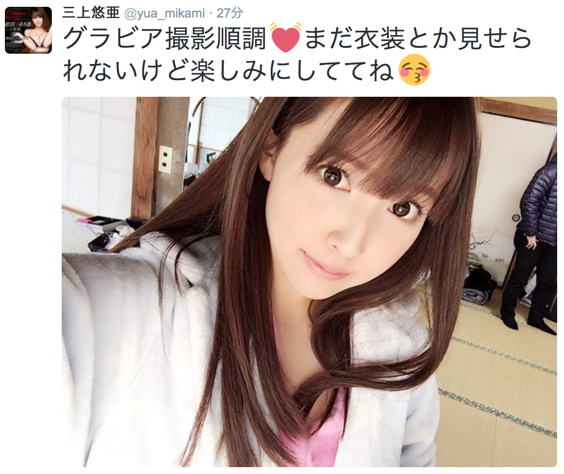 Muteki官網首頁已經預告她要在2月14日舉辦見面會,入場券早就賣光了;到了月底的29日她在大阪為寫真集再辦一場活動,看得出來她是打算用面對面的方式爭取影迷支持。另外,從twitter上也可以發現她又在拍寫真,所以可以肯定的是她不是撈完就走、而是希望用「三上悠亜」這個名字拓展自己的演藝事業:
