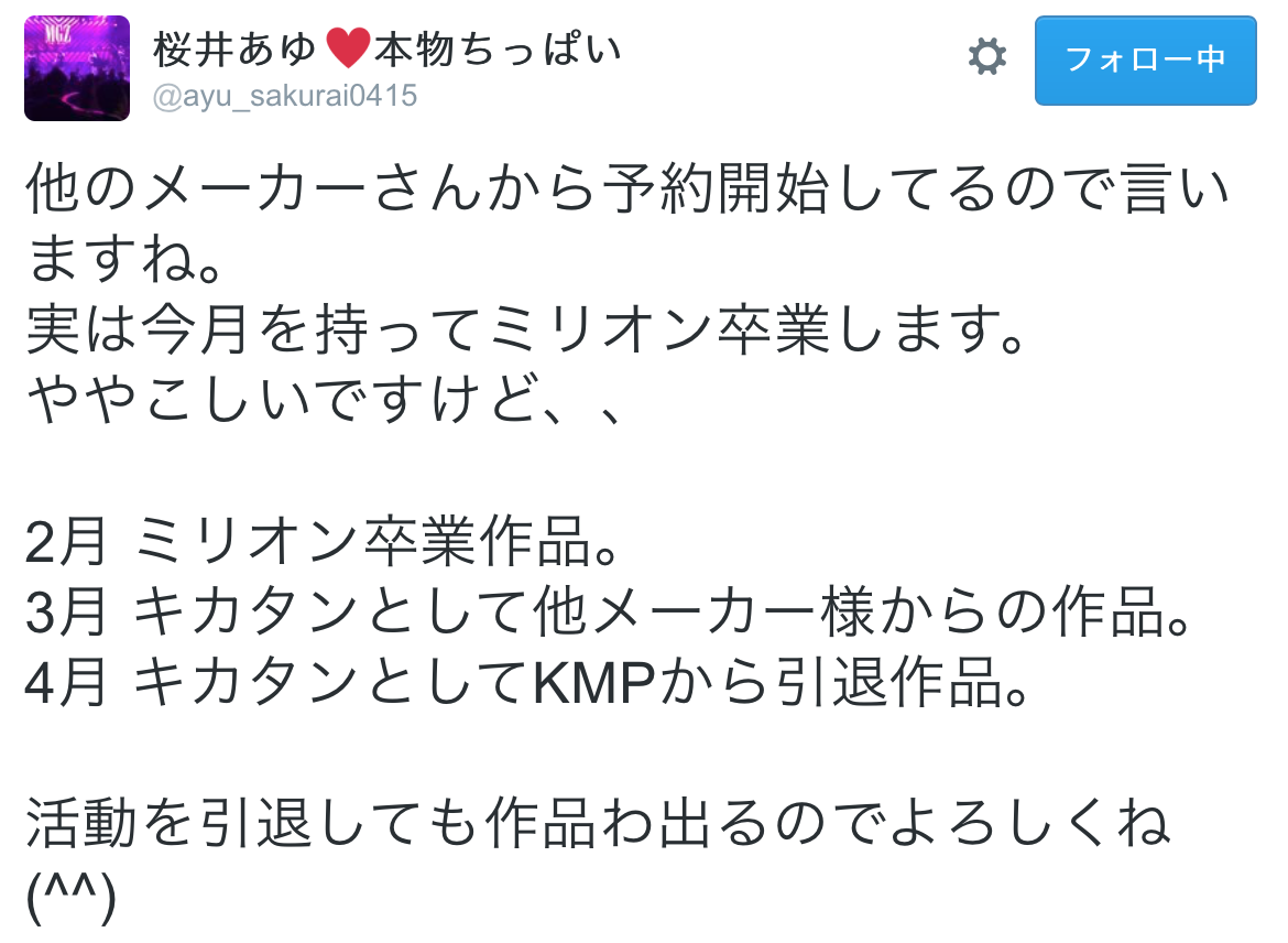 她自己已經在twitter上說了,引退作將會是在4月於KMP發行,這種先不當專屬女優去外面狂拍一輪然後再以企劃女優的身份回來發引退作的方式真是有意思,只能說KMP集團真的很寵也很需要桜井あゆ(櫻井步)才能任她為所欲為吧?