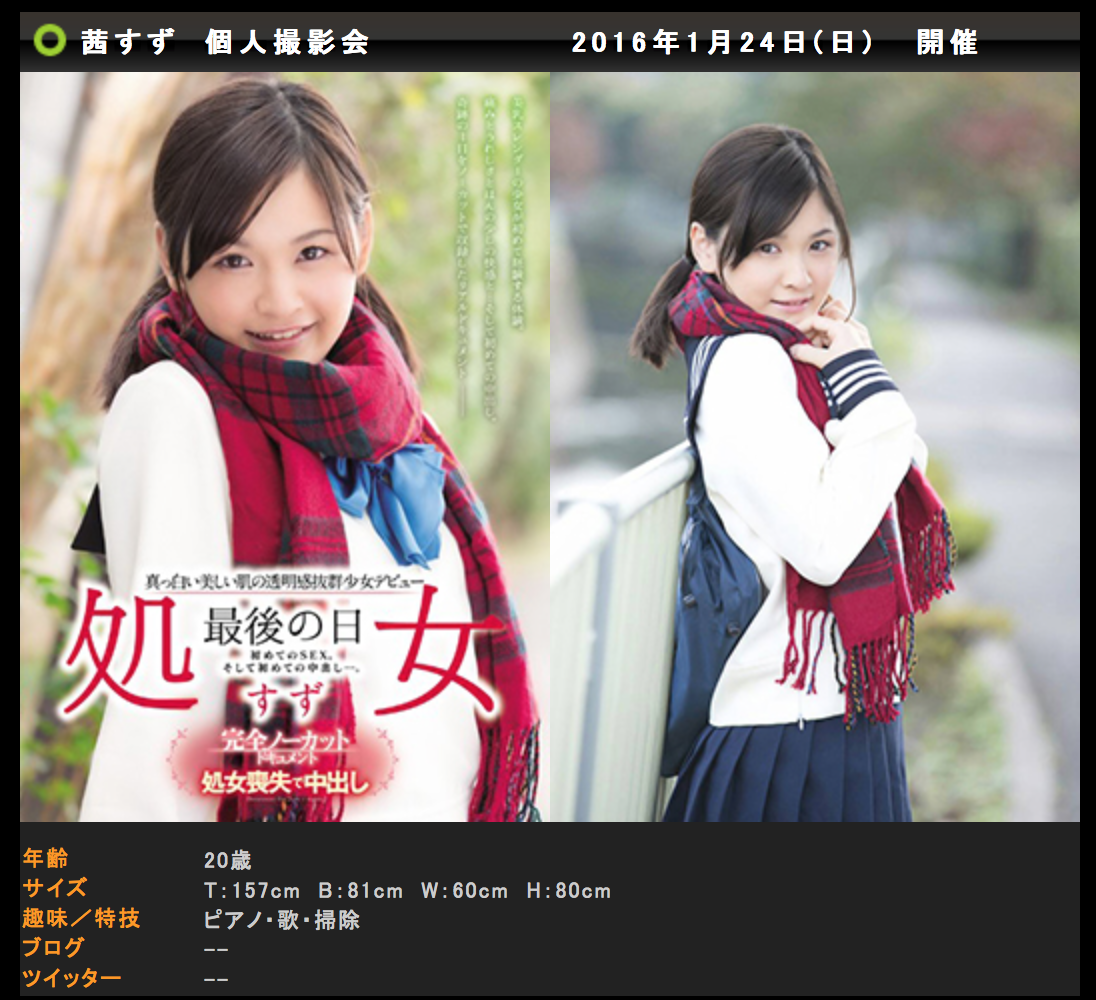 所以「無垢」不但要調製從洞口流出的假洨而且還得加點色素把它做成草莓牛奶的口味。至於這位被破處的少女因為這家片商向來喜歡把女優營造成素顏高中生的形象所以只給了「すず(鈴)」的化名,但在攝影會的網站上這位女優的真實藝名卻藏不住了: