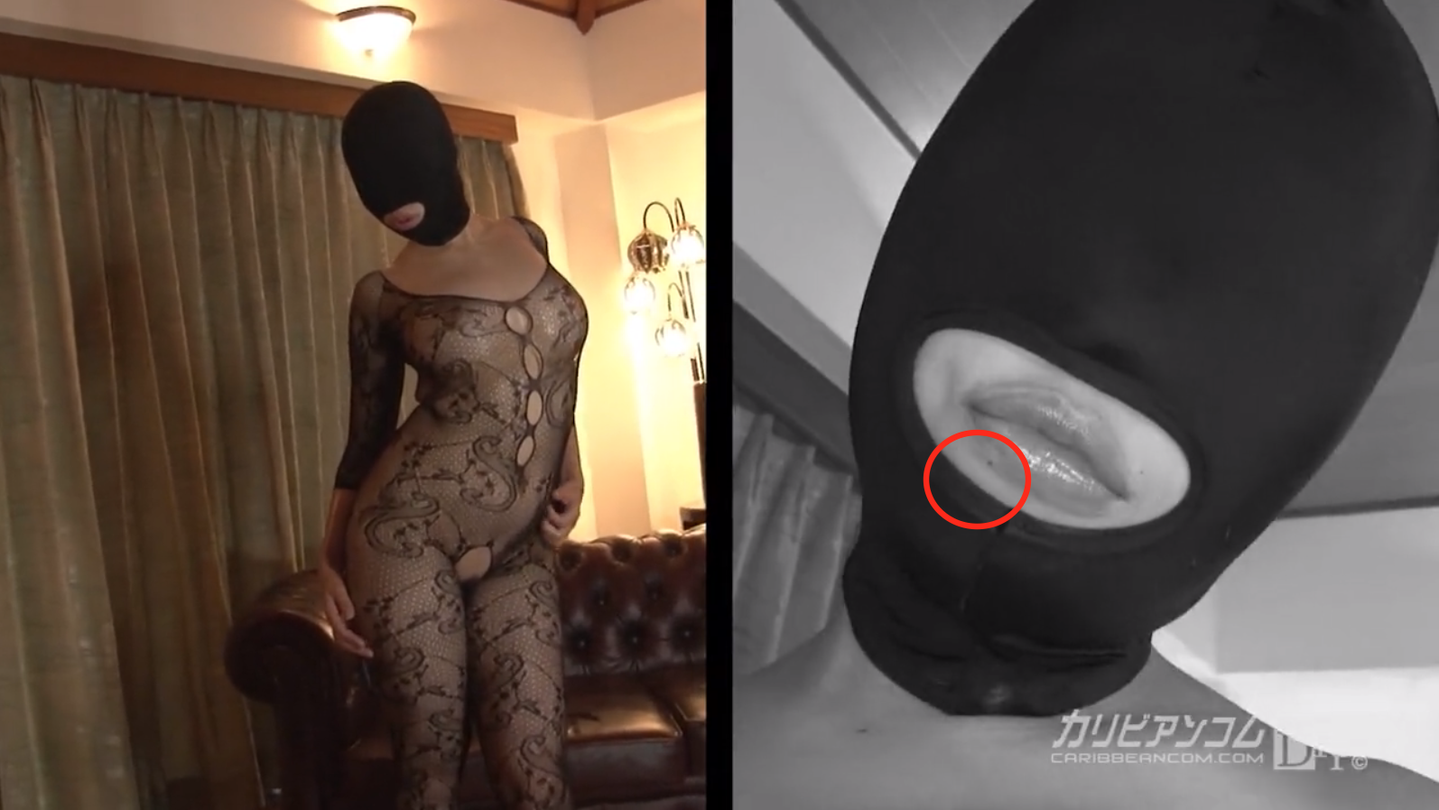 就和2號蒙面俠一樣,カリビアンコム(加勒比)是用了位「初裏」(初無碼演出)的新鮮鮑魚演出,而為了保密身份在33秒的預覽畫面中完全沒看到她的臉蛋。不過有法就有破,透過這33秒的畫面我們就可以抓到這位女優在「嘴唇下方」及「左邊肩胛骨」的地方各有一顆很顯眼的痣…