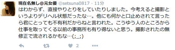 不只如此,與其說是拍AV,静川更覺得自己是被外送來從事性服務的,她很懷疑片子拍好會直接流到無碼界去;更扯的是事後還有人要求封口,但她實在忍不住了所以把一切都掀了出來: