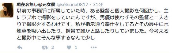 對不起,我看氣氛太緊張所以開個玩笑讓大家輕鬆一下。不過静川剎那(靜川剎那)爆料的內容可不是開玩笑的,在twitter上的三篇推文完整的暴露了AV界的黑暗面:首先,這位女優依約到了用來當拍片現場的小旅館,但那兒只有監督和男優兩人,他們要求静川剎那吸食「水煙草」,結果被發現裡面含有被搗碎的葉子,讓她不由得懷疑那是毒品…