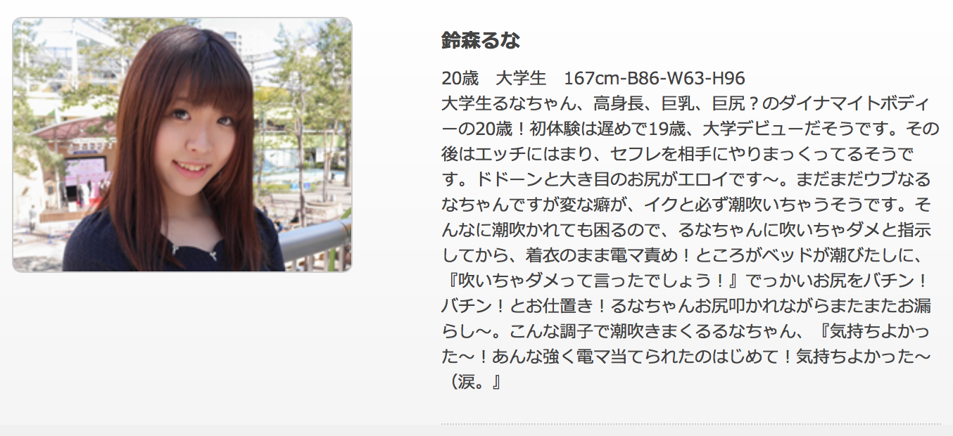 因為在專門經營美少女的網站如「Real Street Angels」、「Tokyo247」以及「REAL FILE」上都能看到她的足跡。也拜這些網路所賜我們不但知道這位女優的藝名是「鈴森るな(鈴森流菜)」也能補上Prestige沒有試看影片的不足掌握她的外型: