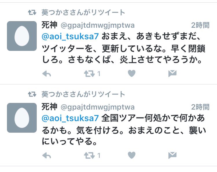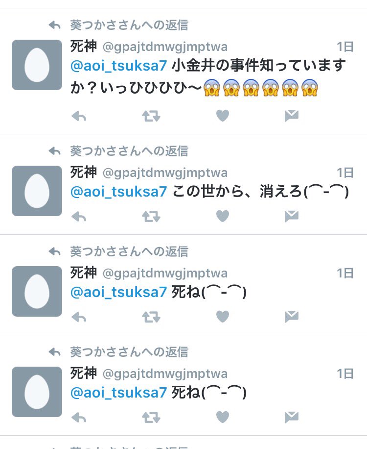 才剛剪短頭髮的天后級女優「葵つかさ(葵司)」就在自己的twitter上遭到留言者死亡威脅:對方嗆她「知道小金井發生的事情嗎(冨田真由被殘殺事件)」、還威脅要在她參加恵比寿★マスカッツ(惠比壽★麝香葡萄)全國巡迴之旅時殺了她~
