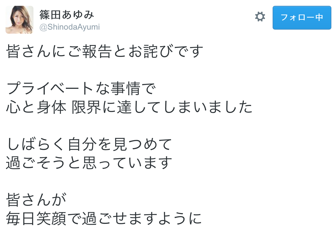 通常前三句話講完就是要和大家說再見了,不過篠田あゆみ(篠田步美)並沒有把話說死,只是用「想暫時好好過著屬於自己的生活」帶過,然後就再也沒更新twitter了…