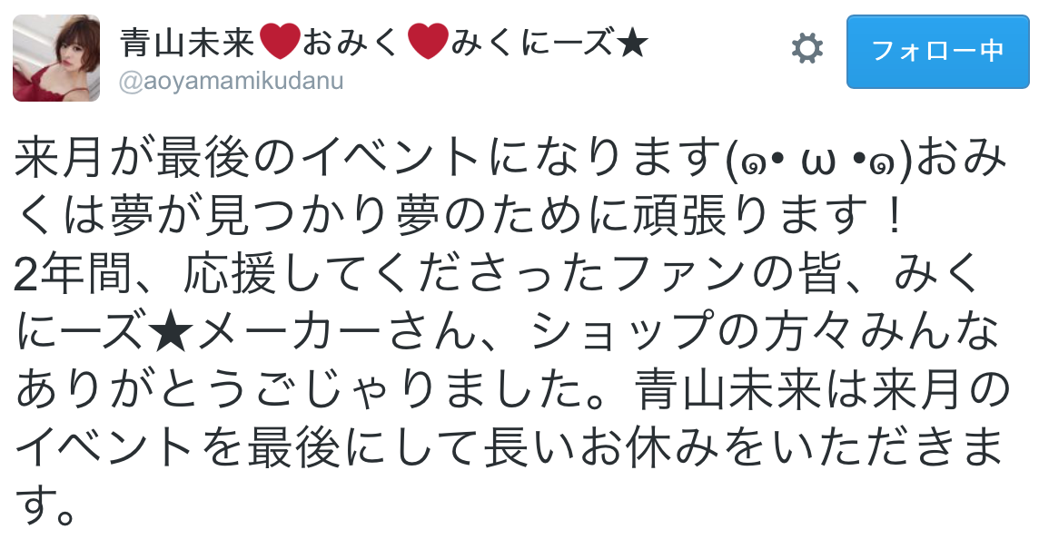 雖然沒有明白講出「引退」兩字,不過青山未来很明白地說自己要去休長假了,雖然日後會發生什麼事還不知道,但我想短期內她應該是不會回歸的: