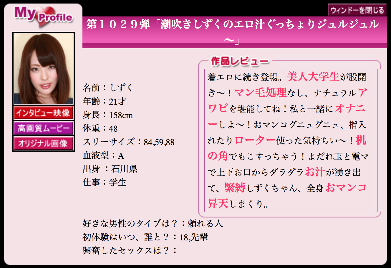 說她是這次新人初脫祭最受注目的女優並不為過,因為她的條件確實不錯而且被放在專做凌辱的劇情片商ヒビノ(Hibino)出道任人都會多看兩眼;而且看了片子就知道被設定是「超M」、「喜歡歐吉桑」的她表現相當出色,不只楚楚可憐的表情十分誘人、敏感的顫抖和不知道是哭還是爽的喘息聲都叫人看得很HIGH,恨不得在淫光幕裡幹活的是自己…