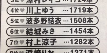 第一名和之前類似的調查一樣,還是由1997年就已經出道、目前仍在奮戰的風間ゆみ(風間由美)阿姨拿下,至於第二名則是有「永遠的蘿莉」之稱、既是AV女優又是事務所高層的つぼみ(蕾),至於深受華人愛戴的波多野結衣則是拿下了第5名,總發片數也破了1500支…