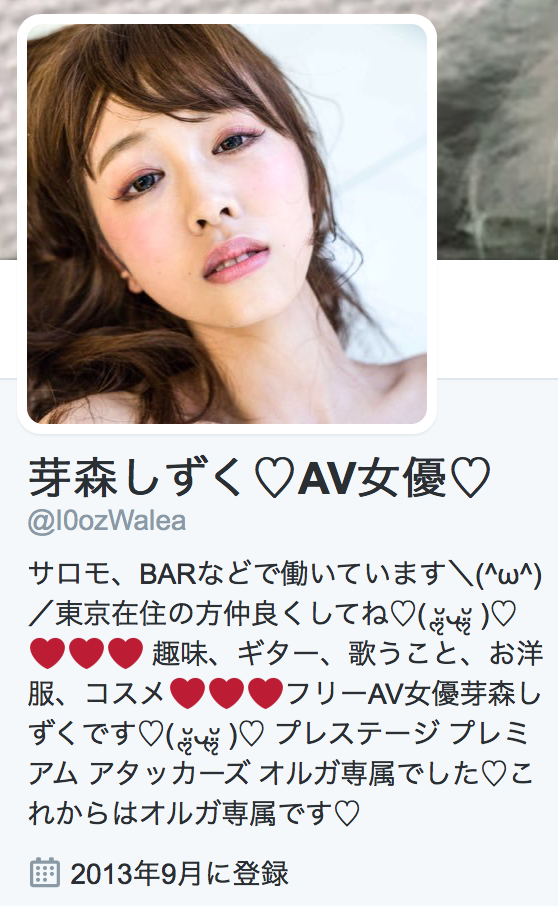 這個twitter帳號(@I0ozWalea)在最近兩天成了許多影迷討論的焦點,比較值得注意的點有三:首先,她原先的職稱是「元AV女優(前AV女優)」,這兩天突然又改成了「AV女優」;第二,在自我介紹欄有提到她是「オルガ專属」、也就是片商「ORGA」的專任女優;最後也是最重要的,那就是她自稱是フリーAV女優(Free AV女優),這意味著她很可能是沒有事務所、自己主導自己的AV生涯…