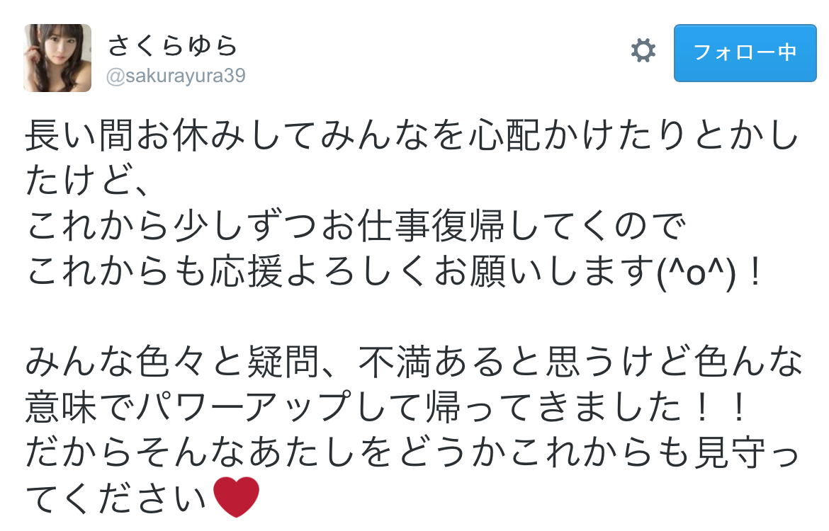 她是在twitter上宣布這個好消息的,雖然用字遣詞稍嫌保守但さくらゆら(櫻由羅)已經明白承諾回歸了,而且她還說自己是Power Up火力更強,請大家替自己加油~