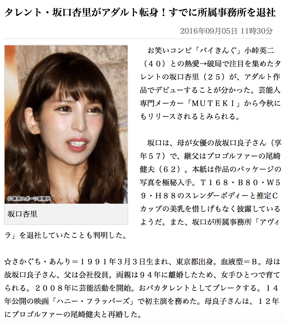 但我還是要說,因為坂口杏里的母親來頭太大所以她的下海也無可避免地讓已經過世的媽媽重新成了大家茶餘飯後的話題,畢竟坂口杏里就是靠母親光環才加入AV界的: