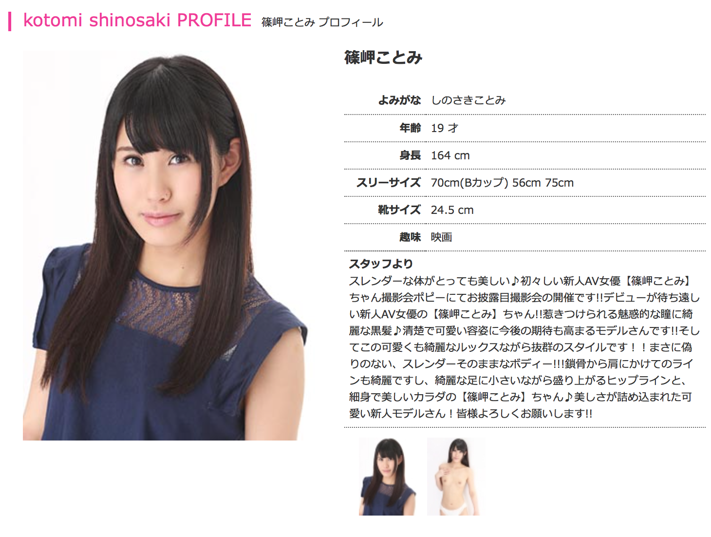 所以「キチックス/妄想族」作品上的「みづき(美月)」之名也是化名,她真正的藝名為在攝影影會使用的「篠岬ことみ(篠岬琴美)」,至此也可以完全確認她就是個新人,東熱的男優們是吃到了個嫩粿~