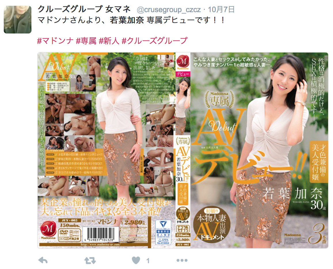 不只是外型條件優秀,若葉加奈背後還有一家強力事務所「Cruse」撐腰,以同事務所的學姐「光井ひかり(光井光)」曾代表出征AV Open的狀況來看Madonna應該也不致於怠慢了若葉加奈,所以她應該會有蠻大的發揮空間: