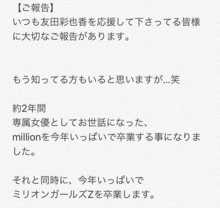 但天下無不散的宴席,友田彩也香還是要與KMP集團分手了,不過喜歡她的朋友也別難過,友田彩也香再三強調她沒有要引退,只是接下來的計畫仍然是秘密…