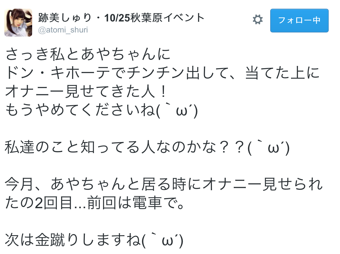 以「貧乳」、「攻擊系小惡魔」形象著稱的女優跡美しゅり(跡美珠里)就在twitter自爆碰到暴露狂,她與另一位女優「宮崎あや(宮崎彩)」在逛百貨賣場時是看到一個男人掏出自己的小寶貝公然自慰,讓她氣得大罵「下次再看到我就踢爆他的蛋」!