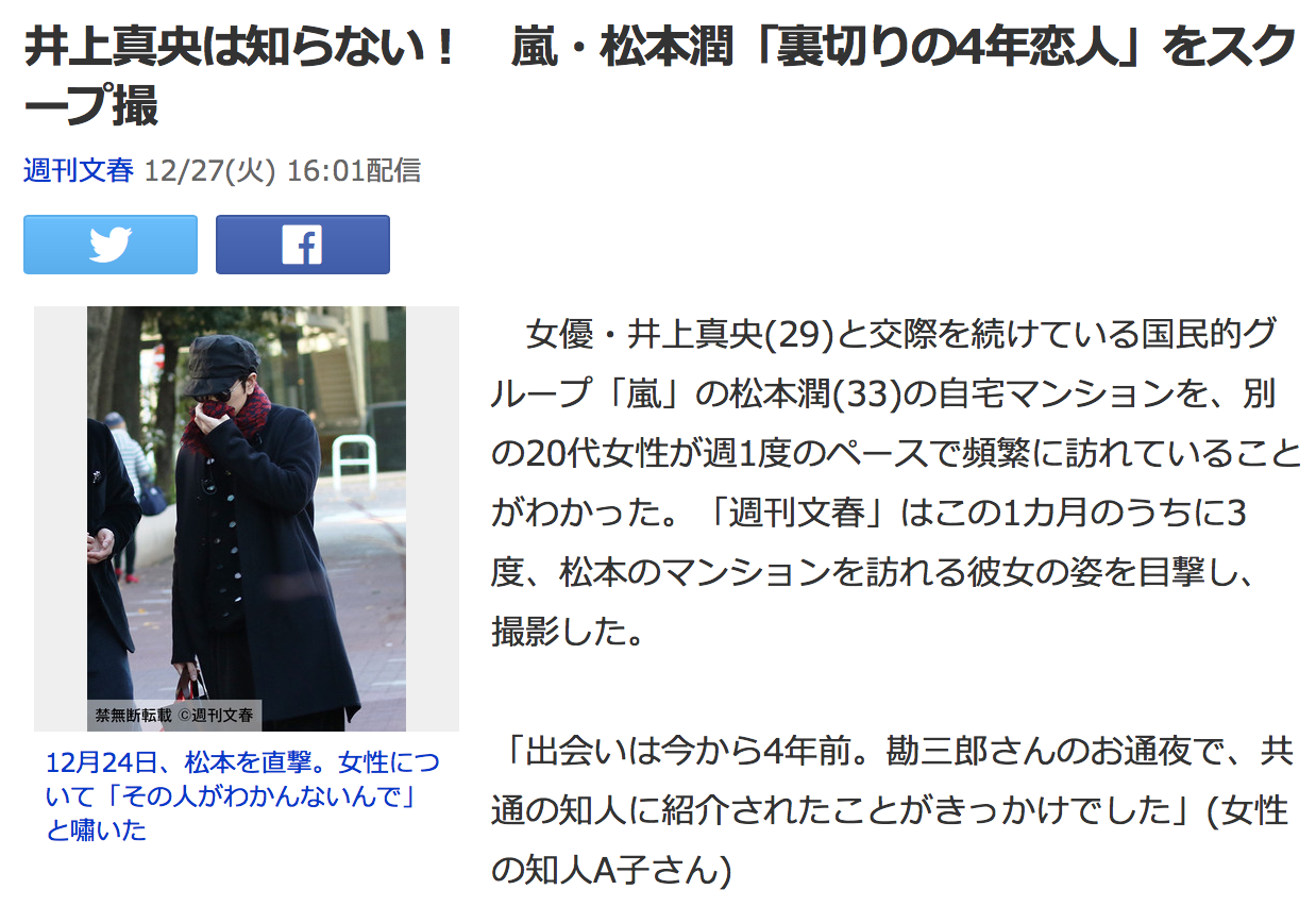 日本的八卦雜誌「週刊文春」最近爆料了偶像團體「嵐」成員松本潤偷吃的消息,據說他是暪著長期交往的女友井上真央頻繁地和某位「A子」約會,對方幾乎每個禮拜都去他家…