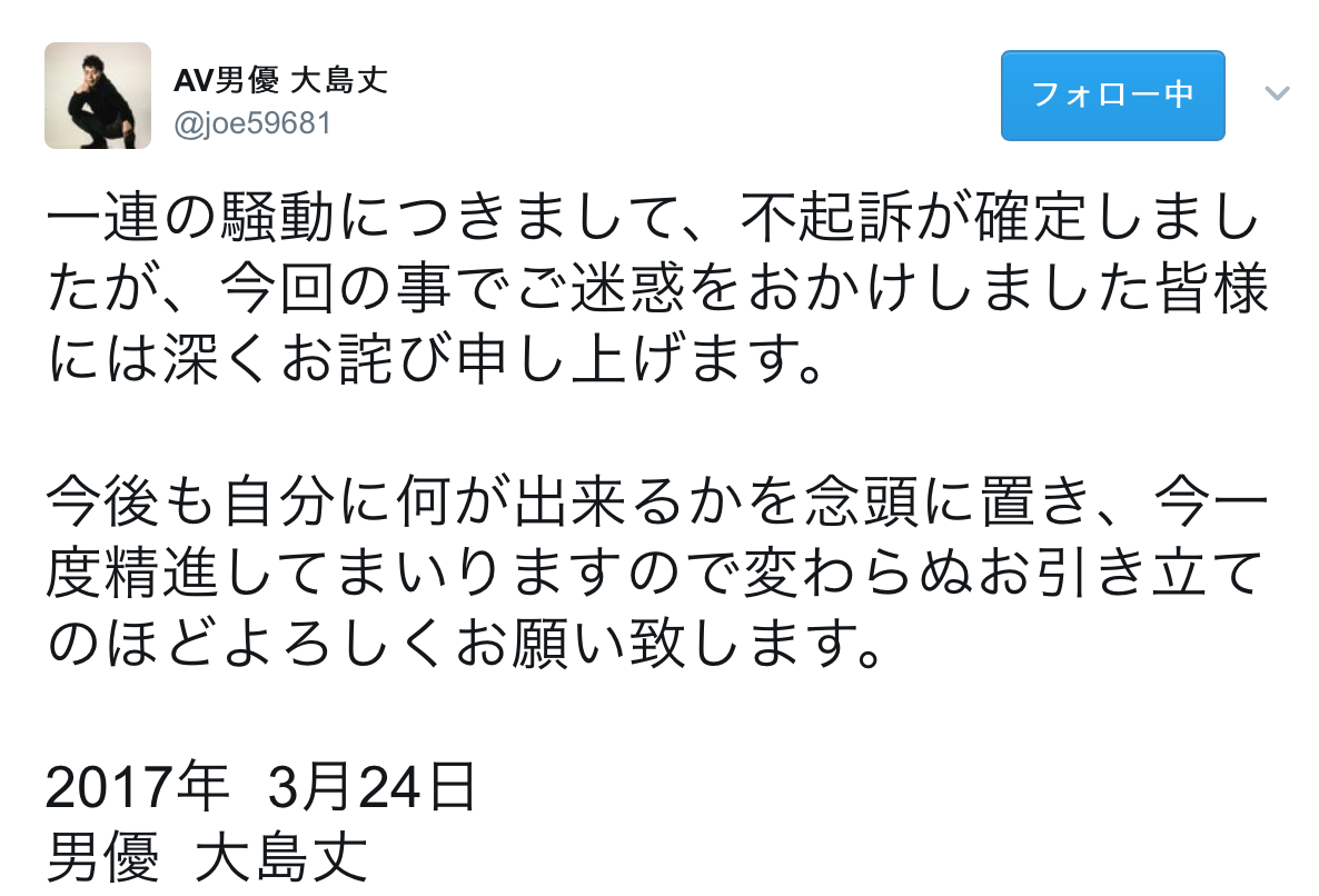 在日本警方打擊無碼界的行動中被捕的男優大島丈昨天在自己的twitter報告了獲得不起訴的消息。雖然上了警車狼狽的模樣曝光、本名也被公布,不過還好,沒事了。