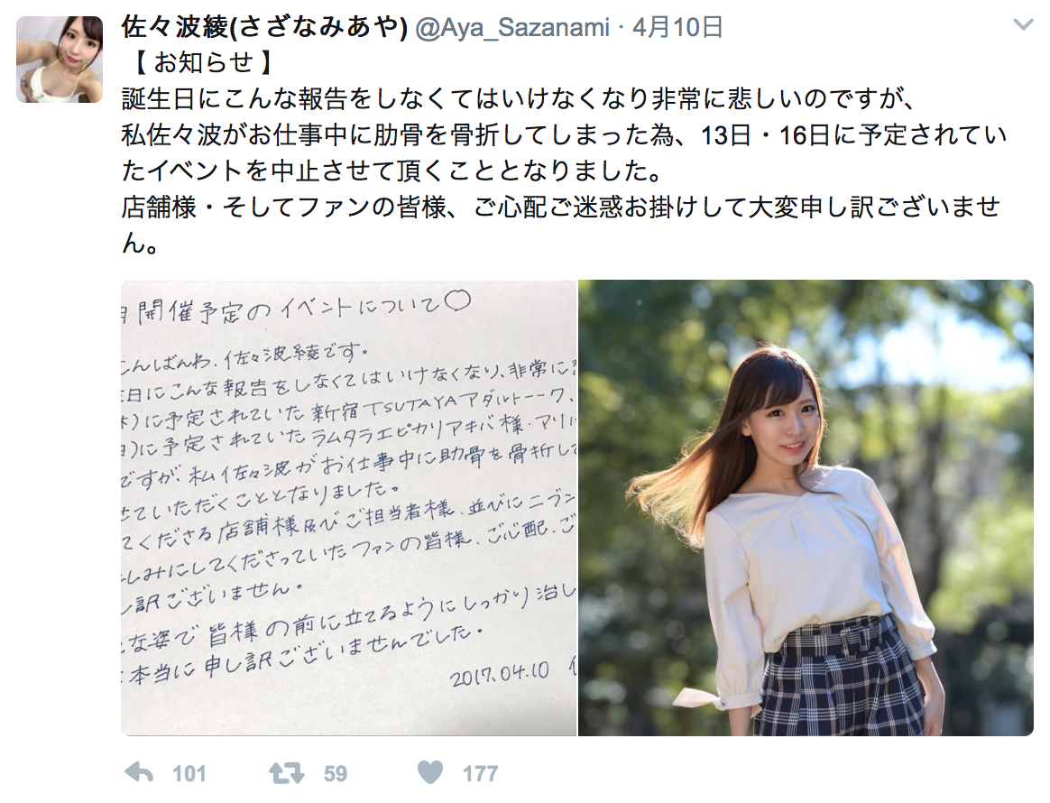 有人開玩笑這可以寫一本名為「十萬個離奇受傷法」的書了。而在AV界也不乏這種怪事,當然啦,這和他們不能用常理判斷、很多女優是用「失蹤」的方式辭職脫不了關係,但像佐々波綾這種受傷方式我還是第一次聽到:
