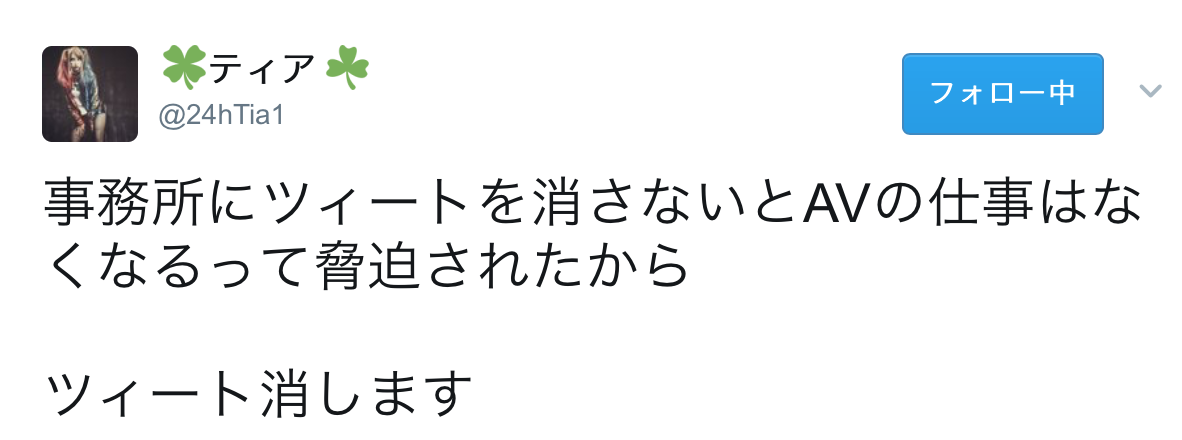 日本向來是個群體社會,講好聽點是大家為了團體努力但一旦想我行我素往往就會遭到集體霸凌,宣傳巡迴影片獨漏她一人沒有制服有如公開處刑,也難怪ティア(蒂亞)會嗆聲要走人。我只是沒想到事務所竟然會用「終結你的AV生涯」來威脅她刪文,不挺自己的女優已經很過份,說出這種話應該更會讓女優覺得灰心吧~