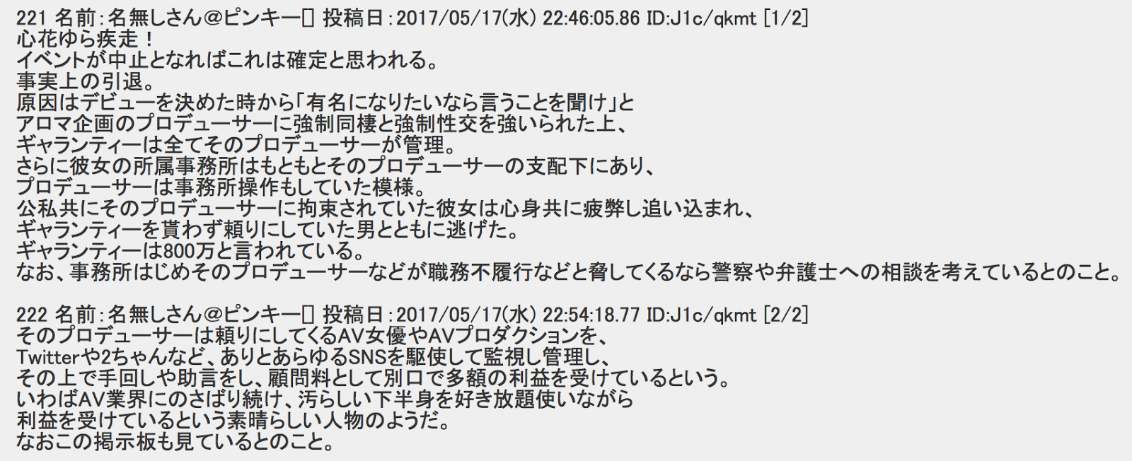 心花ゆら(心花由羅)現在還好嗎?在爆料文中有提到假如被控告「職務不履行」的話那她就要去報警或是找律師諮詢。至於這個爆料是真是假?雖然裡面有些細節我推敲不出來,不過片商的工作人員與外面的事務所有不可說的關係在AV界是很普遍的現象,雖然不能排除是有人帶風向意圖栽贓,不過事務所的公式twitter在近來一個禮拜只轉推了一篇文章的低調作風在此刻看來是詭異的不得了…