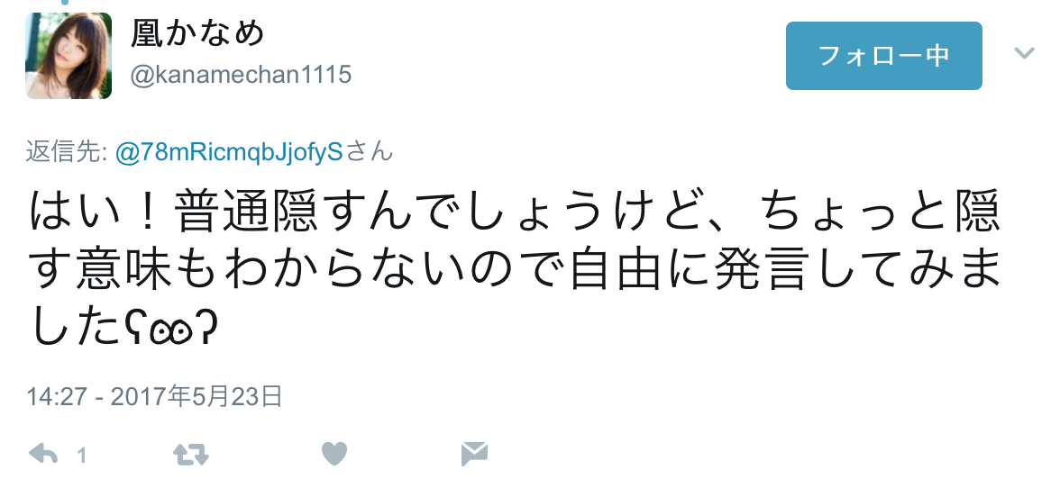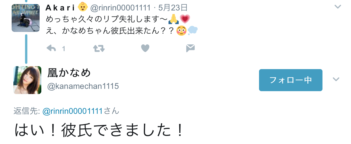 昨天在twitter上她公開宣布自己「有男友了」,此話一出立刻引發軒然大波,對,我知道在AV界女優有男友甚至是老公都不是太稀奇的事,不過凰かなめ(凰香奈芽)可是偶像系的女優呀,對事務所來說那是一個就算有也不能說的事,但偏偏凰かなめ(凰香奈芽)對此毫不在意: