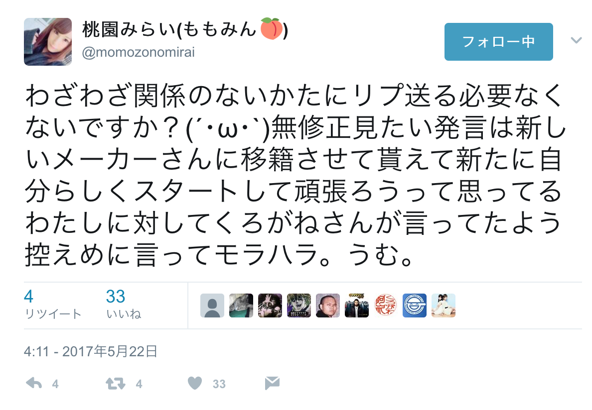 原來是有影迷在twitter上留言希望桃園みらい(桃園未來)去拍無修正(無碼)的作品,結果桃園みらい(桃園未來)以「無碼是違法的」為由婉拒了對方的要求。想不到這位影迷還不死心,不僅一直騷擾個沒完甚至還到處留言狂酸桃園みらい(桃園未來)…