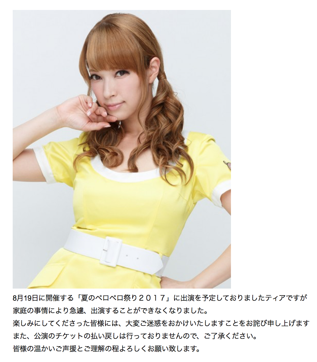 「因為要照顧小孩的緣故,所以我(ティア)沒辦法參加在Zepp的演唱會了,也許會因為這件事被炒魷魚吧。」雖然文章最後ティア(蒂亞)還是請大家多多支持恵比寿★マスカッツ(惠比壽★麝香葡萄),但從這篇文章不難感受到她沮喪的心情…