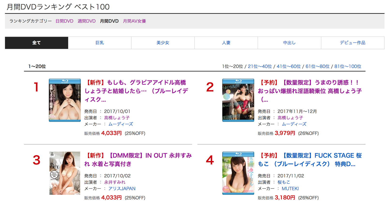 她即將發售的作品「もしも、グラビアアイドル高橋しょう子と結婚したら…」再度拿下了第一名,而且不只是第一名喔,她最新上架接受預約的作品「うまのり誘惑!! おっぱい爆揺れ淫語騎乗位」緊接著拿下第二名,這代表著什麼?作品是9月29日上架的,也就是說高橋しょう子(高橋聖子)只用2天就把所有女優打趴,包括之前賣很好的永井すみれ(永井蓳)和由知名音樂製作人つんく♂(淳君)之前力捧的Muteki藝能人女優「桜もこ(櫻萌子)」都不是她的對手…