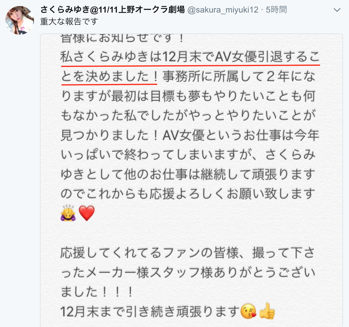 只能說這一行怪事很多,我也不知道さくらみゆき(櫻美雪)回去日本後是不是有發生什麼事,不過好消息是她雖然不拍AV了卻也不是完全消滅,在引退文上她也寫了,未來雖然不拍AV了但她仍然會在其他領域繼續努力加油,請大家繼續支持她: