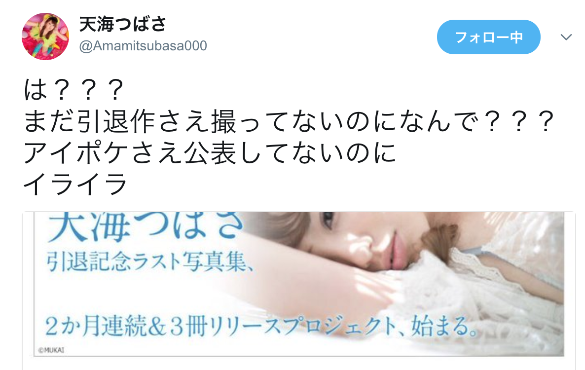 雖然天海つばさ(天海翼)是煩燥地在twitter上寫著:「啊?引退還沒拍啊?ideapocket也沒說出來耶。」不過文是她發出來的,她的反應也不是「亂講」、「胡說八道」,所以明年5月引退應該不是假的: