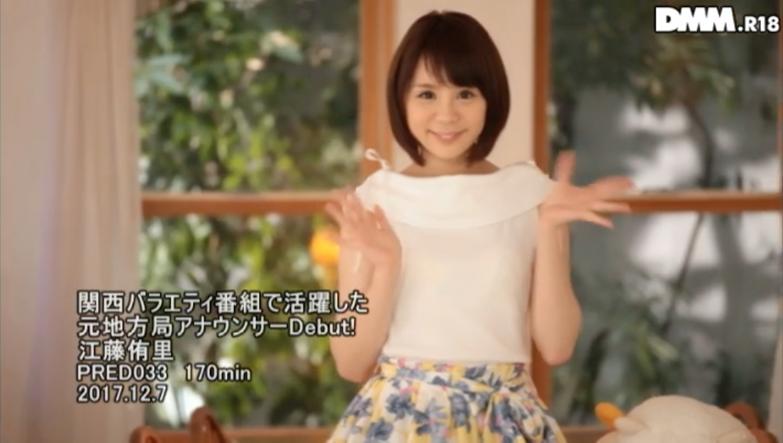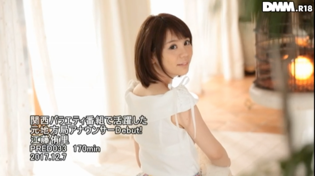 作品名:関西バラエティ番組で活躍した元地方局アナウンサーDebut!品 番:PRED-033發行日:2017年12月~2018年1月預定女優名:江藤 侑里(Eto-Yuri)事務所:All Promotion身高/罩杯: