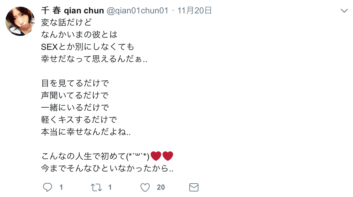「和他,就算不做愛也能感受到幸福。」現在叫「千 春 qian chun」的她是這麼寫著:「看著他的眼睛,聽著他的聲音,輕輕的一吻就能讓人感受到幸福的氣息,這樣的感覺還是人生的第一次~」