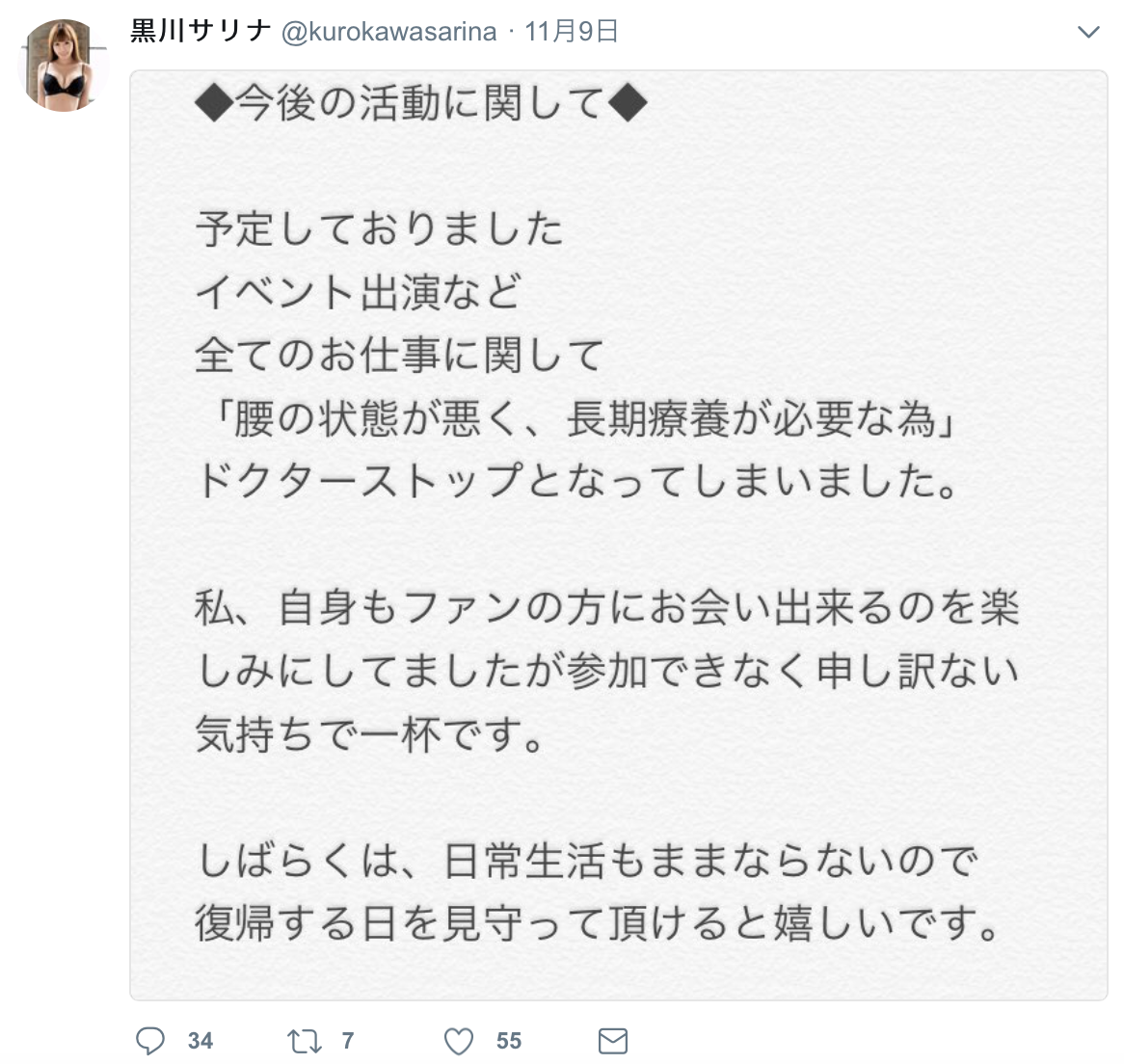 這應該是出了不下於被父母抓到的狀況,現在不是去藏龍了就是已經玩完了;唉,真可惜,雖然她的身材超迷你的(143公分高),不過從片商的宣傳來看她不只長得可愛而且也可以期待演出的爆發力,但現在這種狀況只怕作品都沒得看了。但乙都さきの(乙都咲乃)可不是Prestige唯一一個出狀況的專屬女優,另一位以身材著稱的「黒川サリナ(黑川紗里奈)」也是臨時取消活動,然後有一陣子沒更新twitter了:
