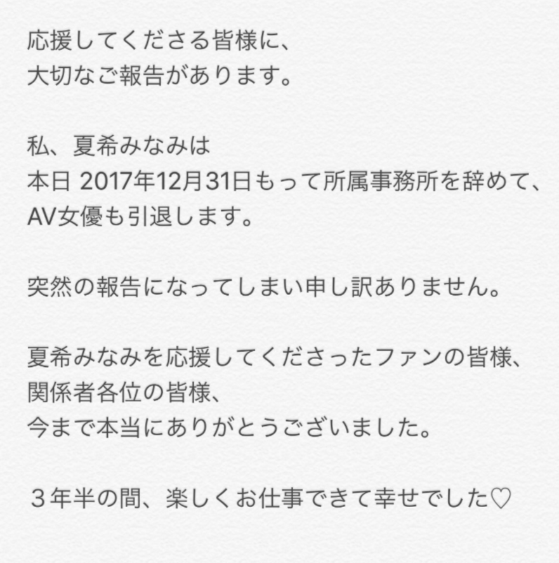 趕在2017年的最後一天,前Prestige專屬、也是近來最著名的筋肉系女優夏希みなみ(前譯夏希南,她自己比較喜歡叫夏希美波)在twitter上宣布引退,結束了三年半的AV生涯。