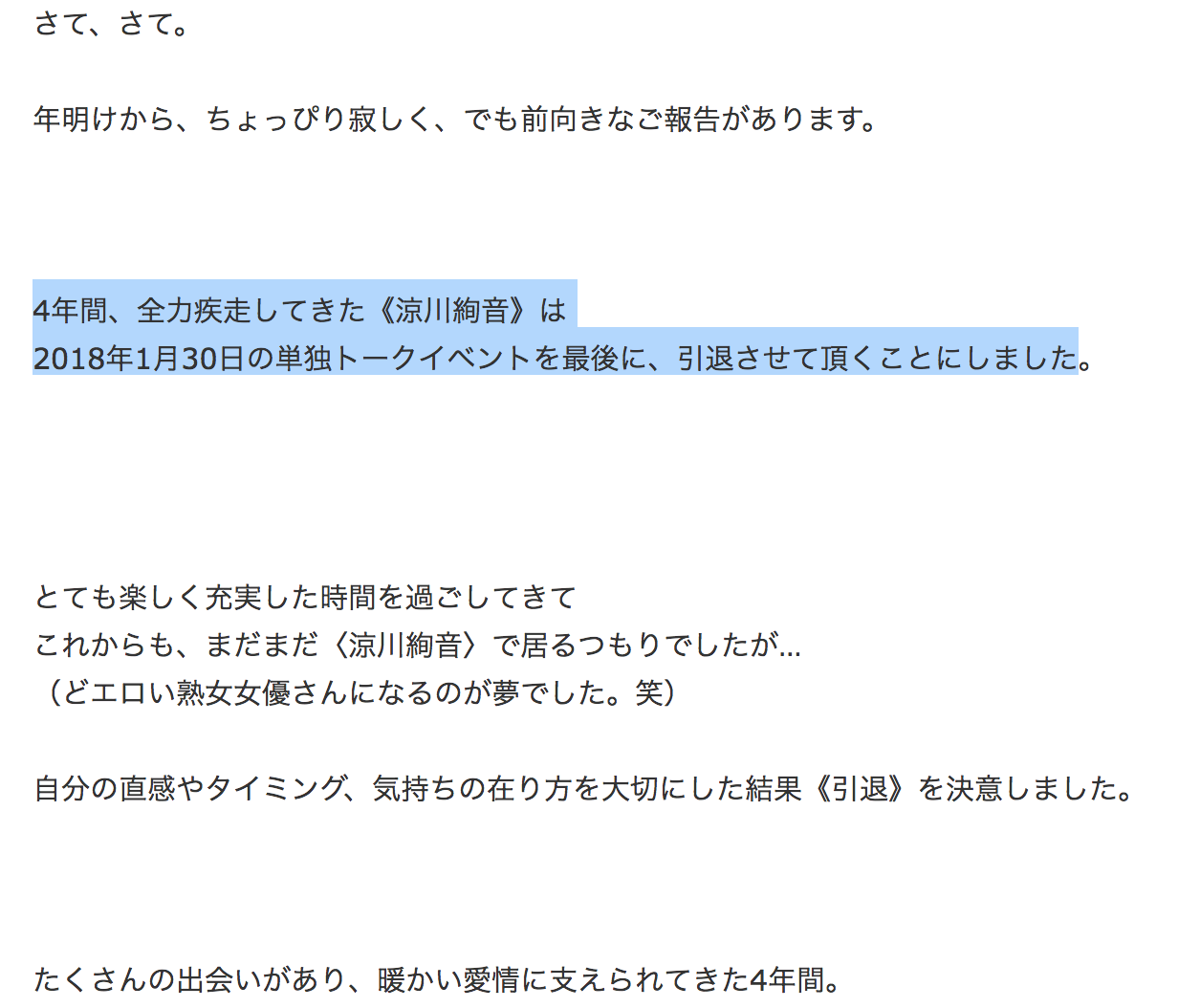 昨天夏希みなみ(夏希南,夏希美波)在距離2017年結束前緊急宣布引退已經夠讓人難過了,想不到與她一起到事務所Arrows、也是曾經和我們舉辦攝影會並且參加TAE台灣成人博覽會的「涼川絢音」也在Blog宣布將在一月底的活動後引退: