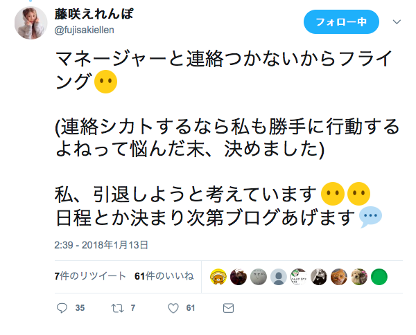 跟著一堆女優的腳步,肥美片商Fitch專屬的優質乳牛「藤咲エレン(藤咲愛倫)」也在twitter上宣布引退。在這裡順便和大家介紹一下女優宣布引退的正統流程,女優在確定不玩後要先和經紀人報告,然後經紀人再轉達給社長,如果大家都沒意見再來研究什麼時候讓女優離開…