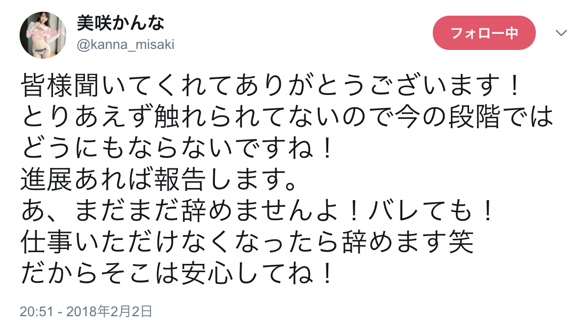 美咲かんな(美咲佳奈)的說法是家裡的氣氛很詭譎,家人沒有多說什麼,她也只能當做沒事,不過她也和影迷承諾不會因為家人的壓力就引退,「如果哪一天我選擇引退,那一定是因為沒有工作上門啦」…
