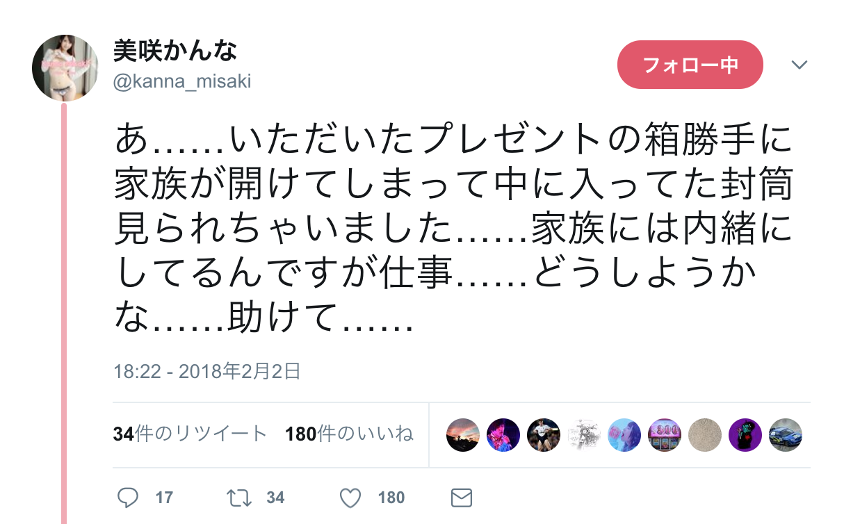 2014年年底出道、之前在VR作品大放異彩的女優「美咲かんな(美咲佳奈)」昨天在twitter上自爆「影迷送的禮物被家人拆開了」、「裡面的卡片也被看過了」: