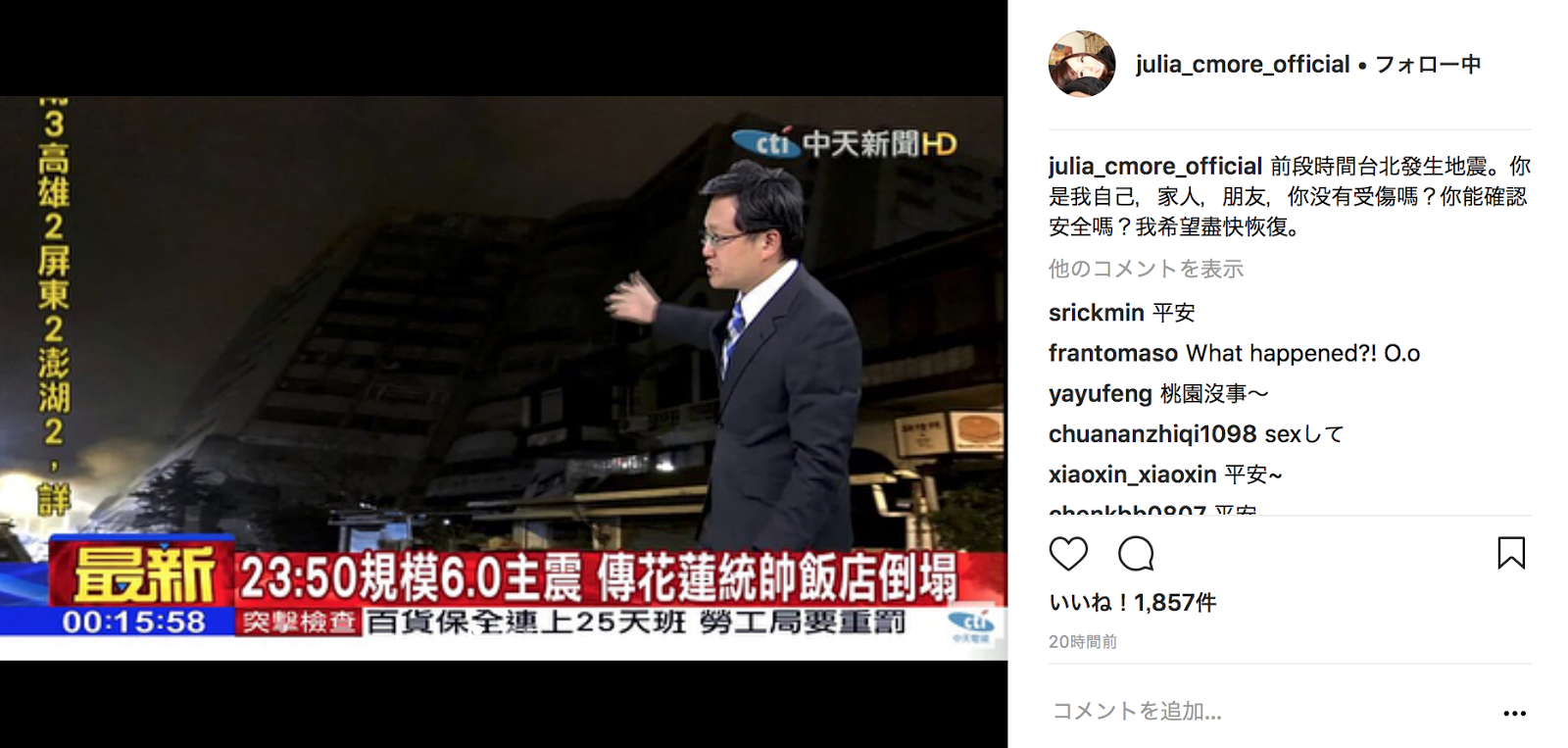 一個從沒來過台灣、一個今天來到台灣,同樣都關心台灣的震災,至於來過台灣的女優更沒忘了問候影迷,像Julia不知道從哪裡弄來中天新聞台的播報截圖呼籲影迷注意安全~