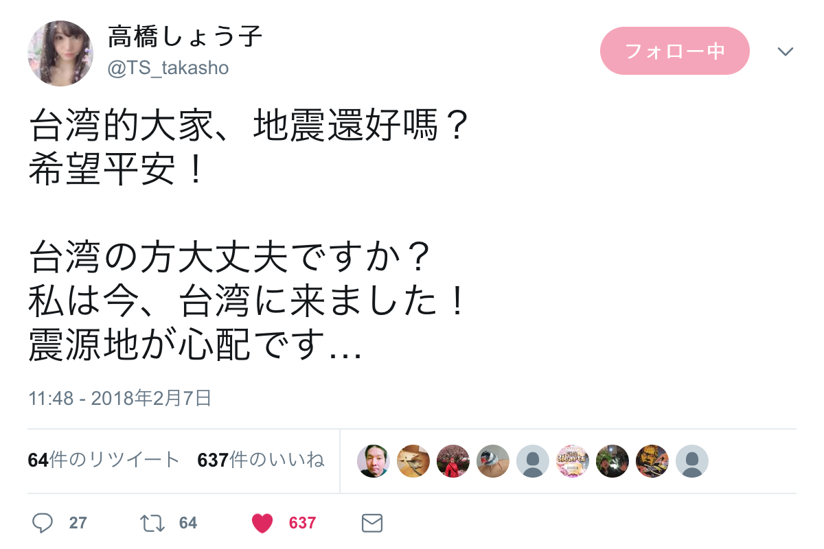 另外,昨天陪同加藤鷹參加AVH見面會的女優也實際體驗了強震的滋味,就算日本地震也很多,但昨天的地牛翻身仍然讓大家餘悸猶存。至於今天與三位男優一同來到台灣的AV天后高橋しょう子(高橋聖子)也在twitter上以中日文對照的方式問候影迷,希望大家一切都好: