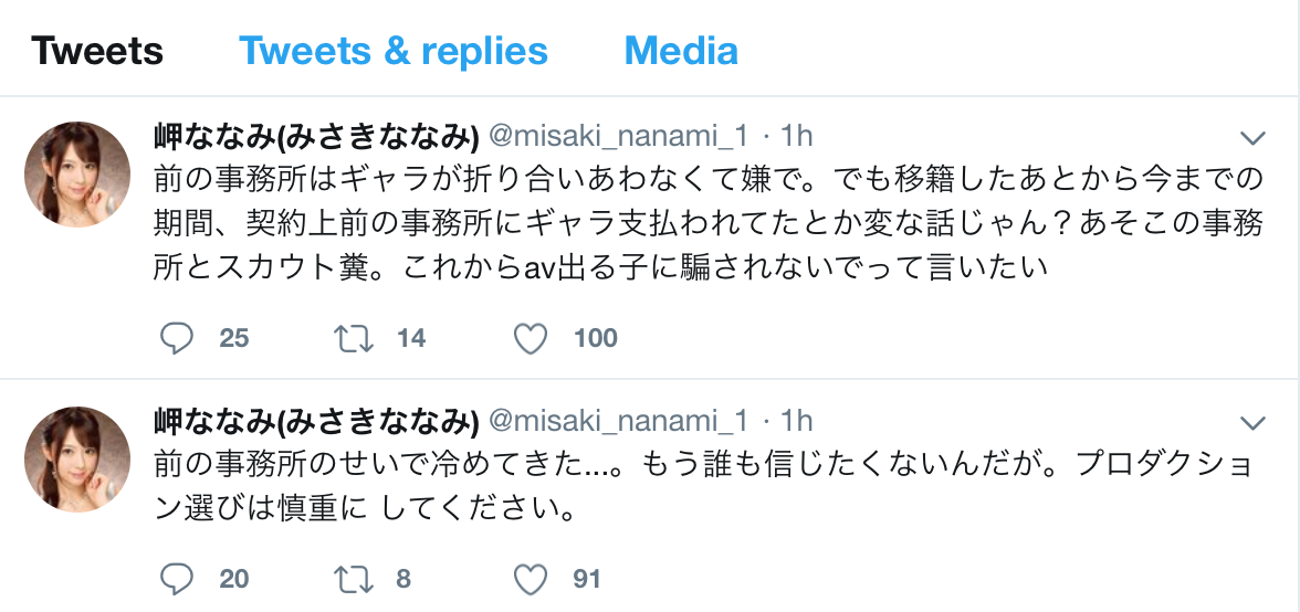 昨天早上,她在twitter上暴走幹譙前經紀公司C-More,日本人是這樣子的,就算私底下再肚爛但檯面上都會盡量克制情緒不要惡言相向,但換句話說,如果是直接惡言相向那代表已經不爽到極點,像之前香西咲離開原事務所At-Honeys時在Blog寫的那些話誰看了都知道事情大條。而岬ななみ(岬奈奈美)是在twitter上控訴前事務所抽成比例太高,還說要把這些事告訴新進入行的女優以免更多人受害: