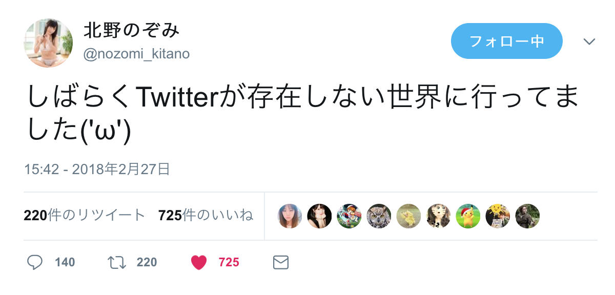這話其實蠻有意思的,北野のぞみ(北野望)上一次主動發文是2017年的1月5日,在這一年多她應該都是在沒有twitter的世界過活。不過應該也沒人在乎北野のぞみ(北野望)寫的東西合不合邏輯,重點是我們從2016年年底等到現在、她有沒有回歸AV界的可能?