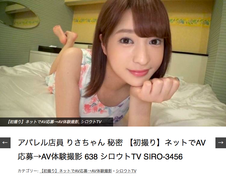那就是演出「【初撮り】ネットでAV応募→AV体験撮影 638」的女主角「りさ」:沒錯,這是AV先修班MGStage的作品,片中並沒有提供太多有關她的資料,只說根據外型判斷這位女優應該有23歲了,然後她是18歲的時候破處、目前已經和10個人發生性關係了…
