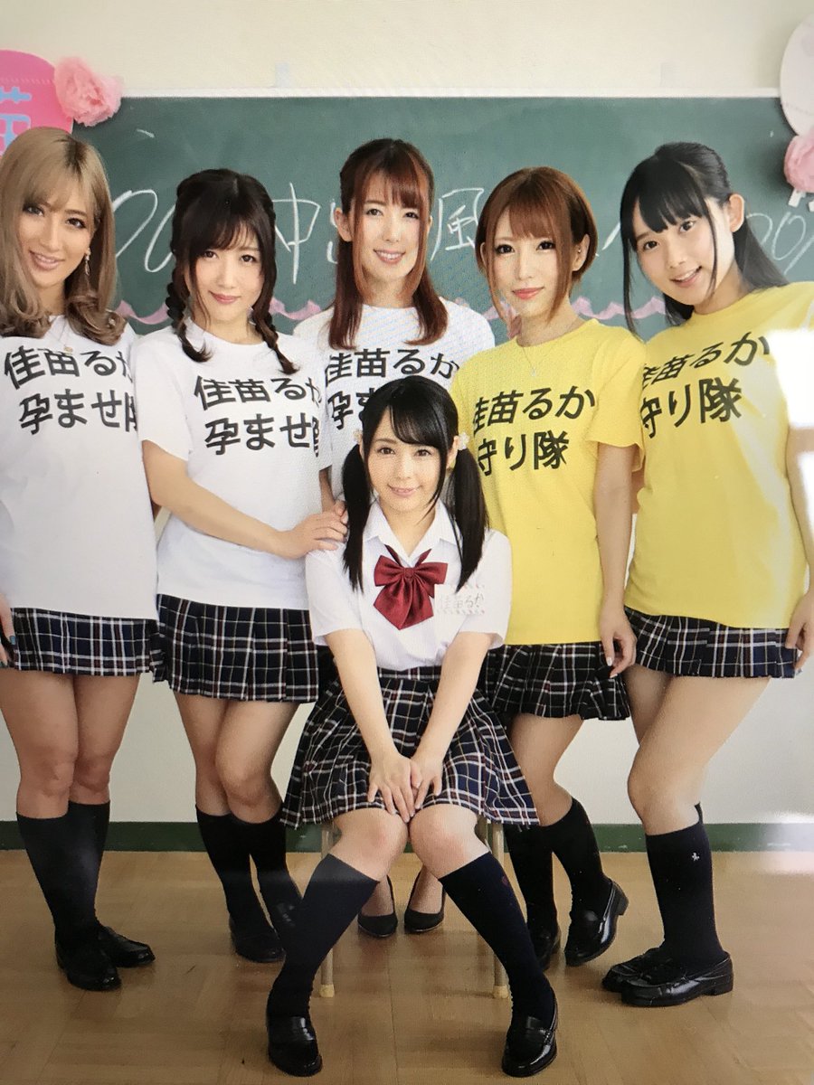 請大家看看由片商「本中」及參與演出的女優PO出來的照片,穿著學生服的佳苗るか(佳苗琉華)自然是第一女主角啦,但其他配角的打扮是不是讓你有很熟悉的感覺?從宮崎あや(宮崎彩)、葉月七瀬穿著黃色的親衛隊T恤,而波多野結衣、大槻ひびき(大槻響)及AIKA則是穿著白色的受孕隊制服,再加上一堆看似素人的男優相信很多人都會和我一樣心中一驚: