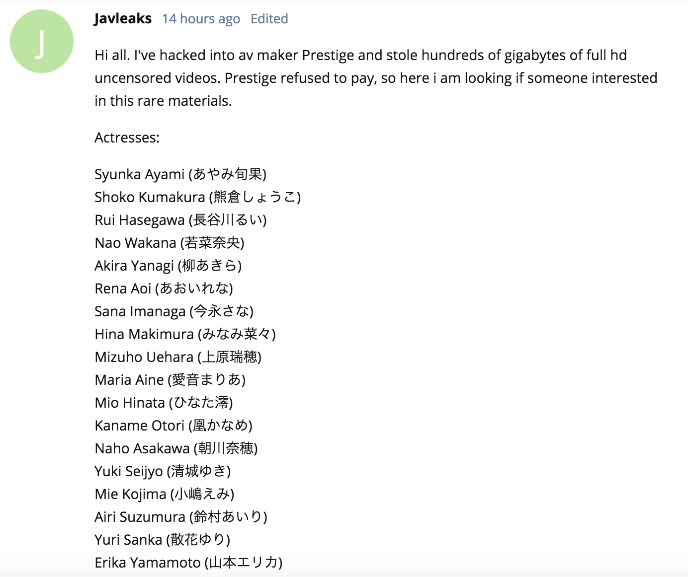 結果Prestige拒絕了這位駭客的要求,所以他一氣之下就到網站討論區發言,除了公布手上有的名單外也流出女優「嶋野遥香」的下半身…