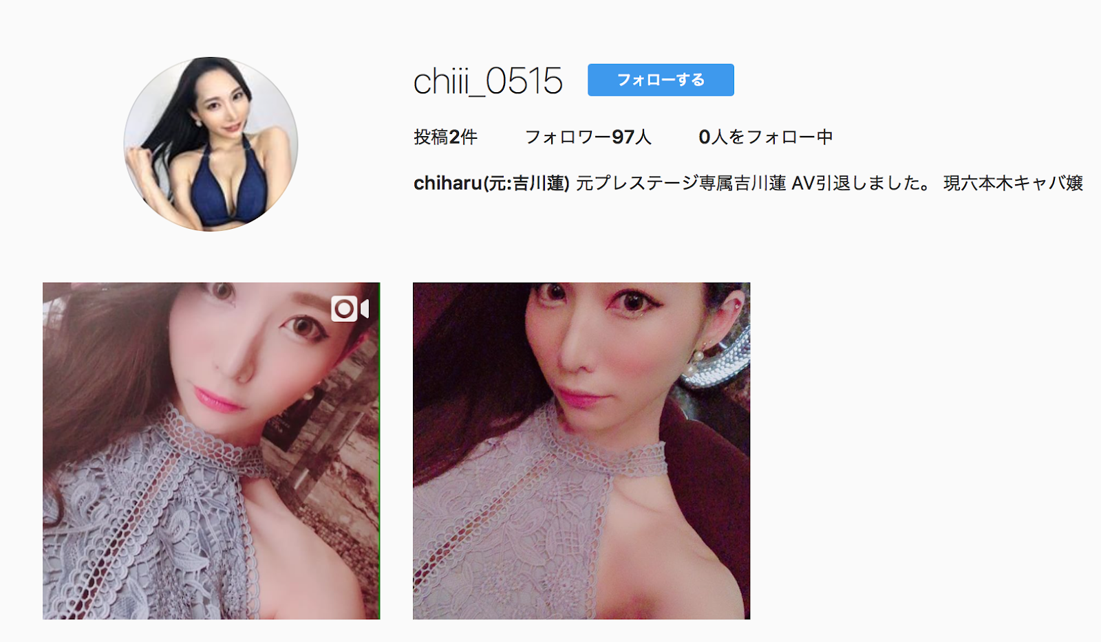為什麼?吉川蓮已經告訴我們答案了,在文章後,她留了一個Instagram的帳號,你只要點過去就可以看到改名為chiharu的她不但把職稱改為「元プレステージ専属」(前Prestige專屬女優),也告訴大家她現在是在六本木做「キャバ嬢」(陪酒妹),應該是想學長谷川るい(長谷川留衣)用社群網站為自己促銷: