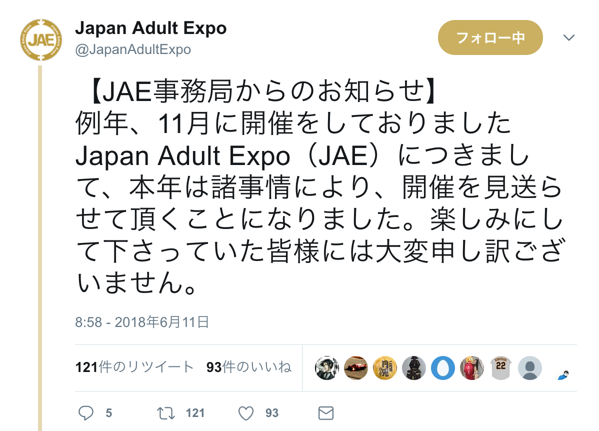 JAE(日本成人博覽會)的官方twitter在今天宣布,因為「諸多因素」所以今年不會舉辦活動,至於替代方案嘛…目前也還在研究,總之,先把今年的活動取消再說~